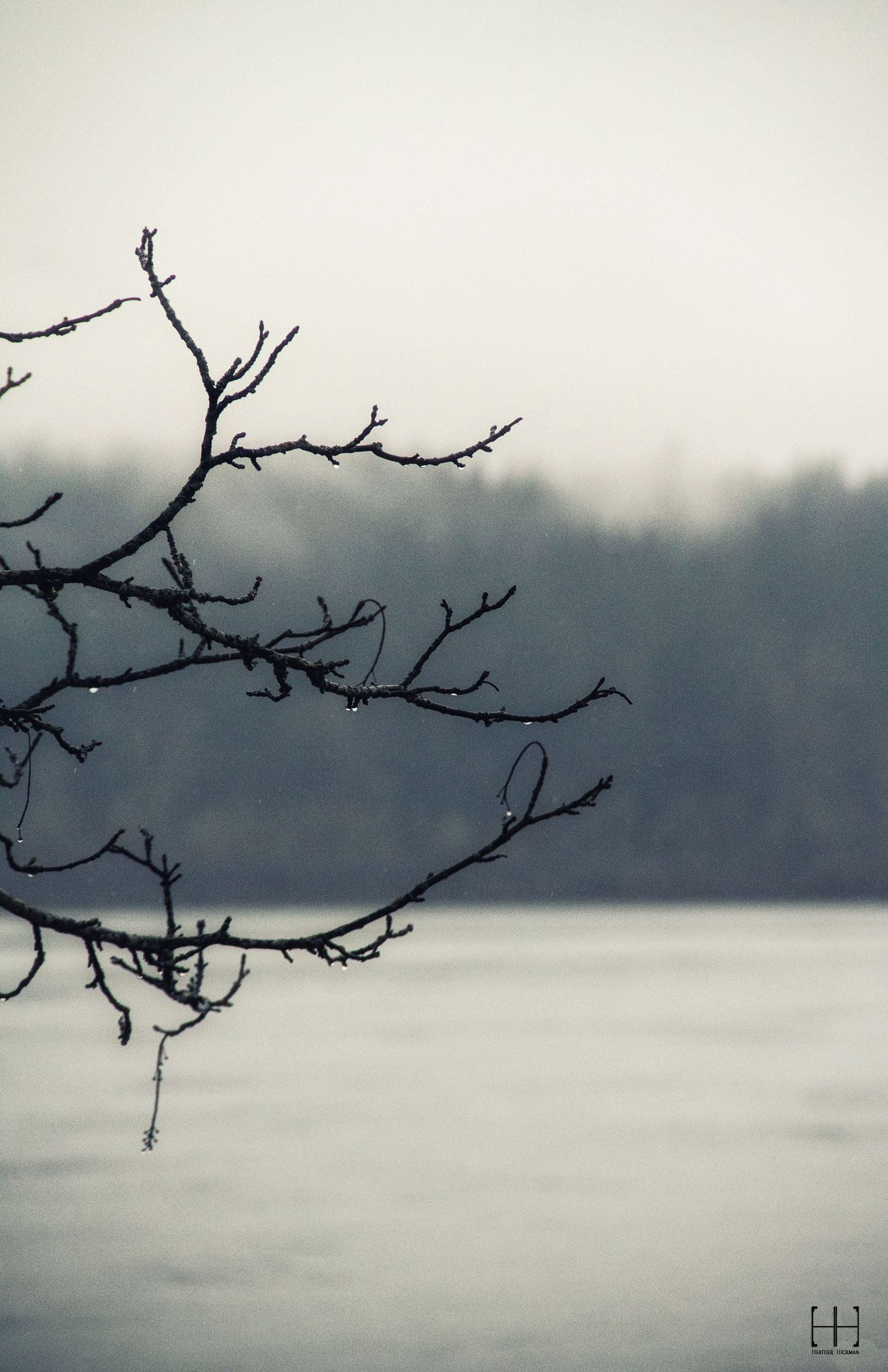 A tree on an island in the Columbia River, against a foggy, rainy background.Perfect on metal.